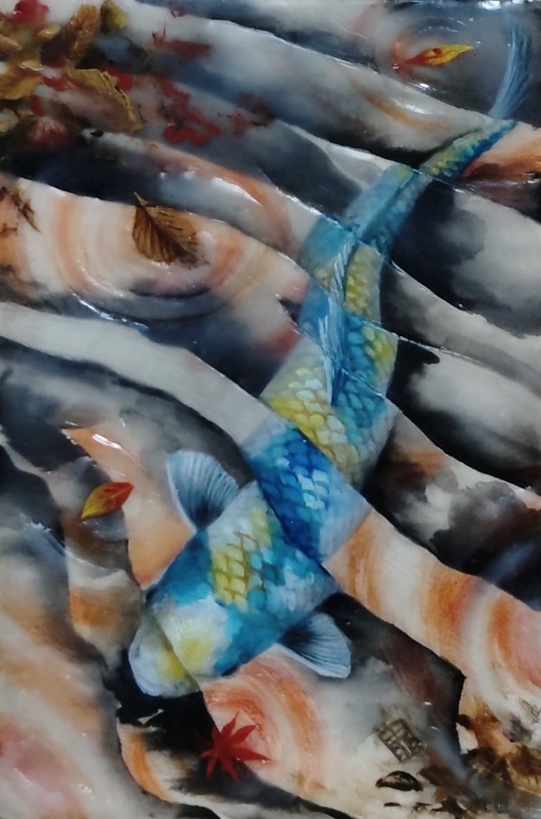 鯉は好きなモチーフの1つですが、鯉が元々持っているイメージを、何か新しく独自のものにできないかと思い、まずは色彩を変えて描いてみました。